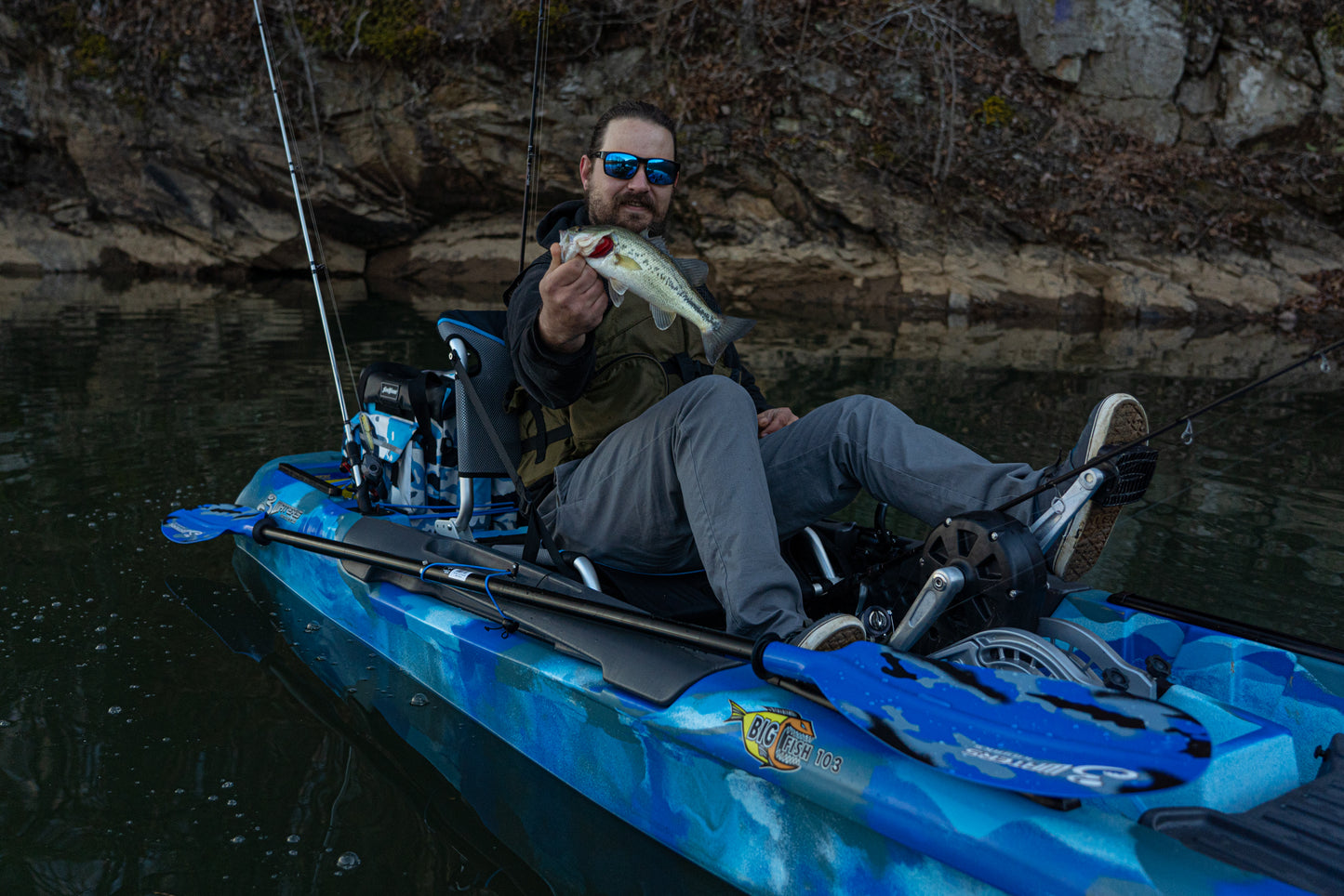 At only 10' 6" but with a capacity of 397 lbs, the Big Fish 103 is the pedal kayak that can be your primary fishing vessel, or a comfortable and easy to use recreational boat for a relaxing day on the water that the whole family can enjoy.